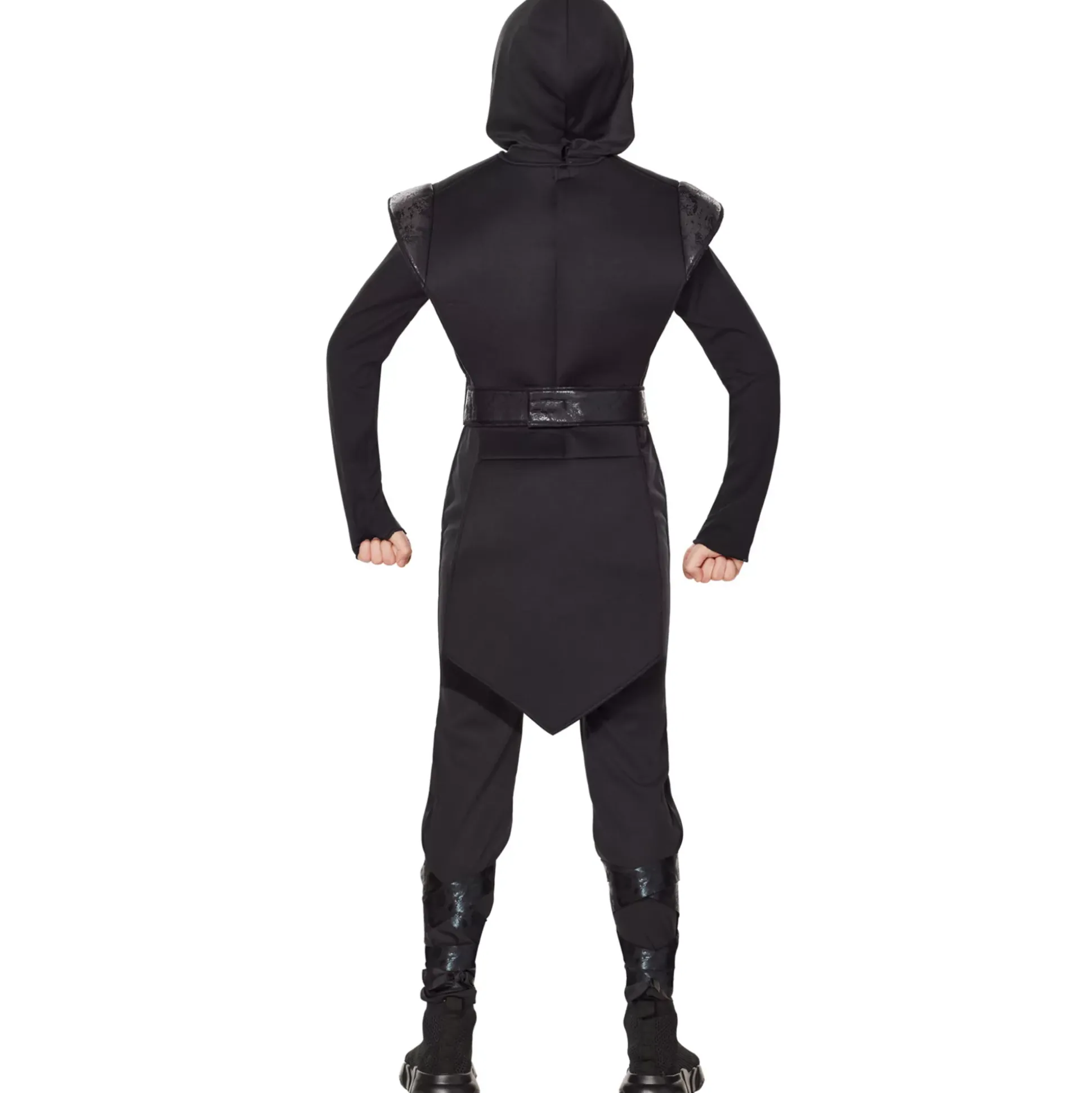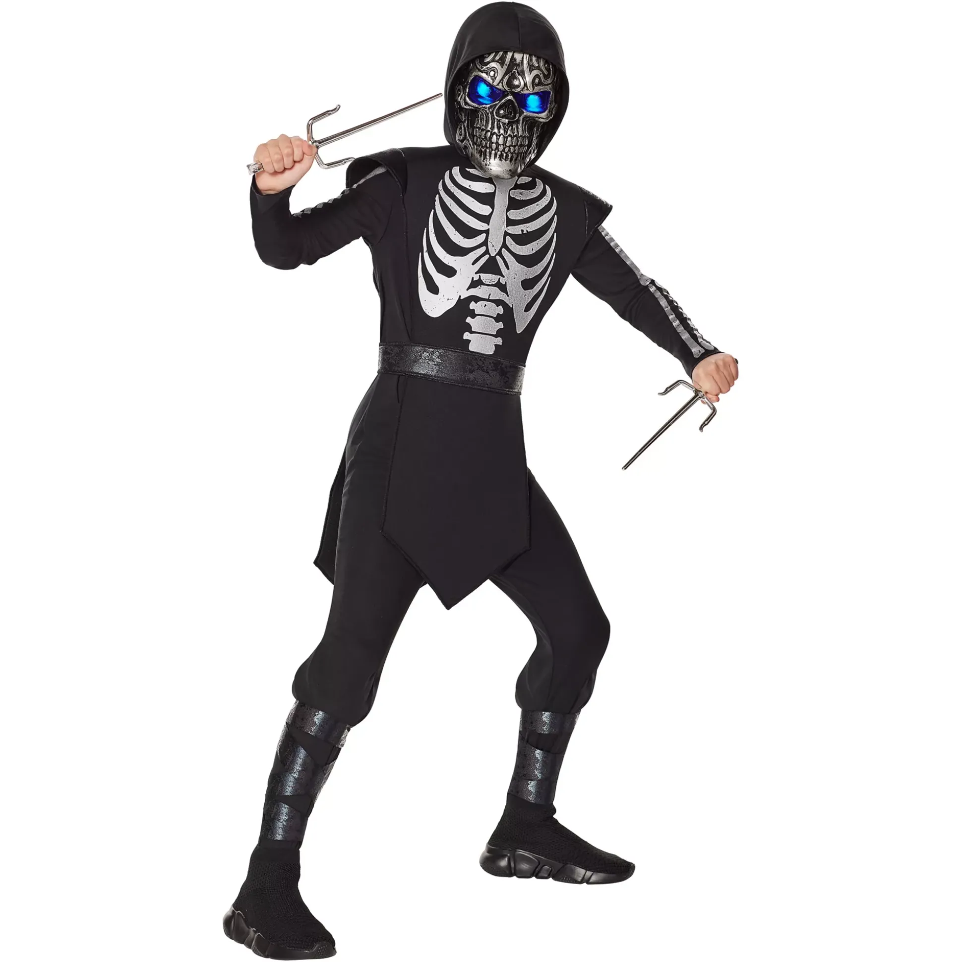 Become a fast and frightening force in this skeleton ninja costume! This costume includes a black jumpsuit with white bone graphics along each sleeve, matching ninja armor with cap sleeves and a waist belt, action-ready leg wraps, and a skeleton mask with haunting light-up eyes.