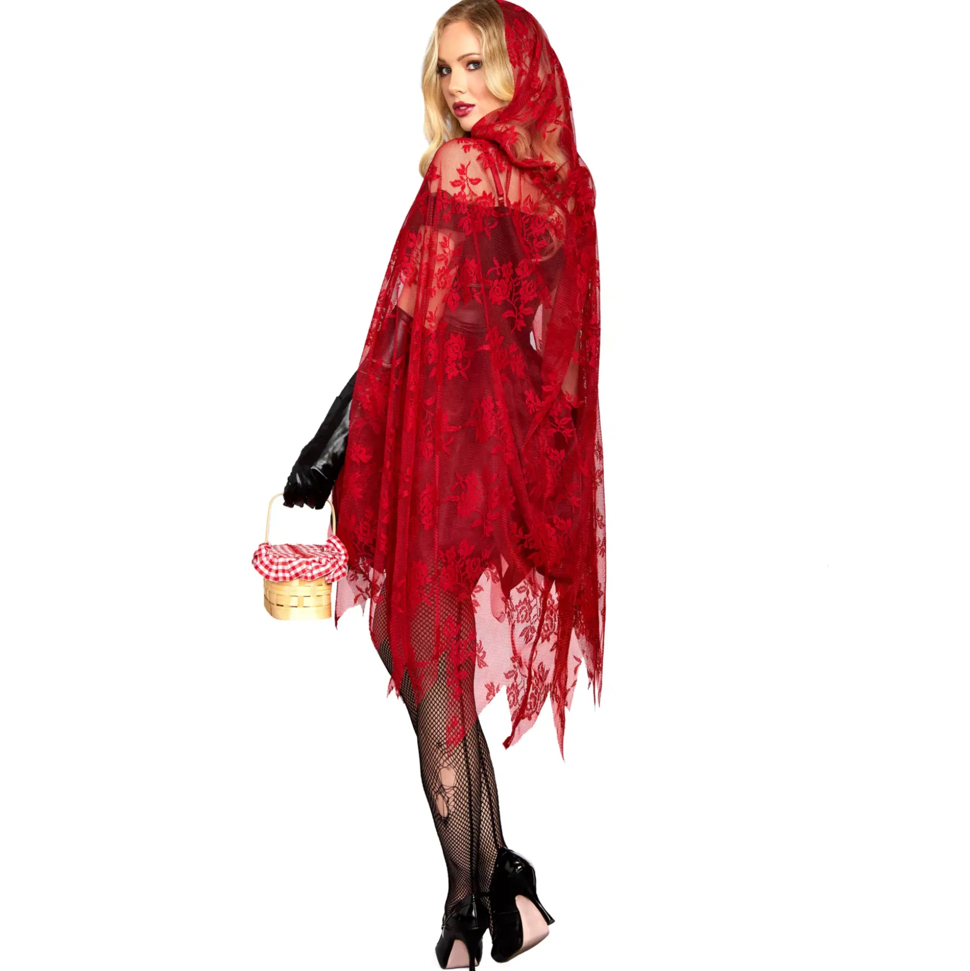 Show that wolf who’s boss in this dangerous red riding hood costume! This sultry red riding hood costume features a corset-style bodice with a tattered red skirt. A sheer, lacy red cape with an attached hood adds an elegant touch to this little red getup.