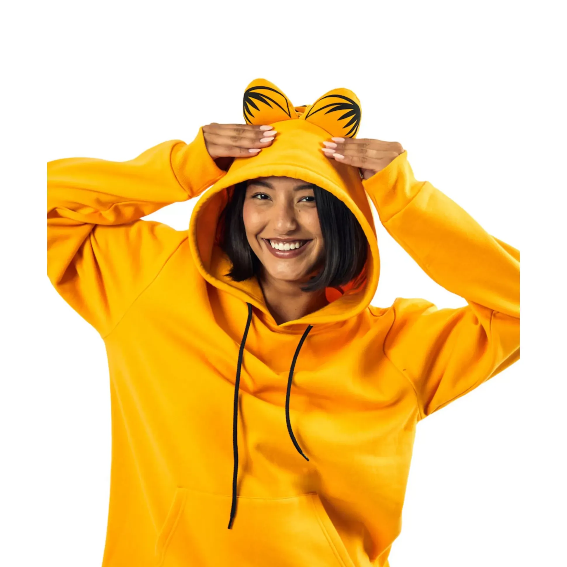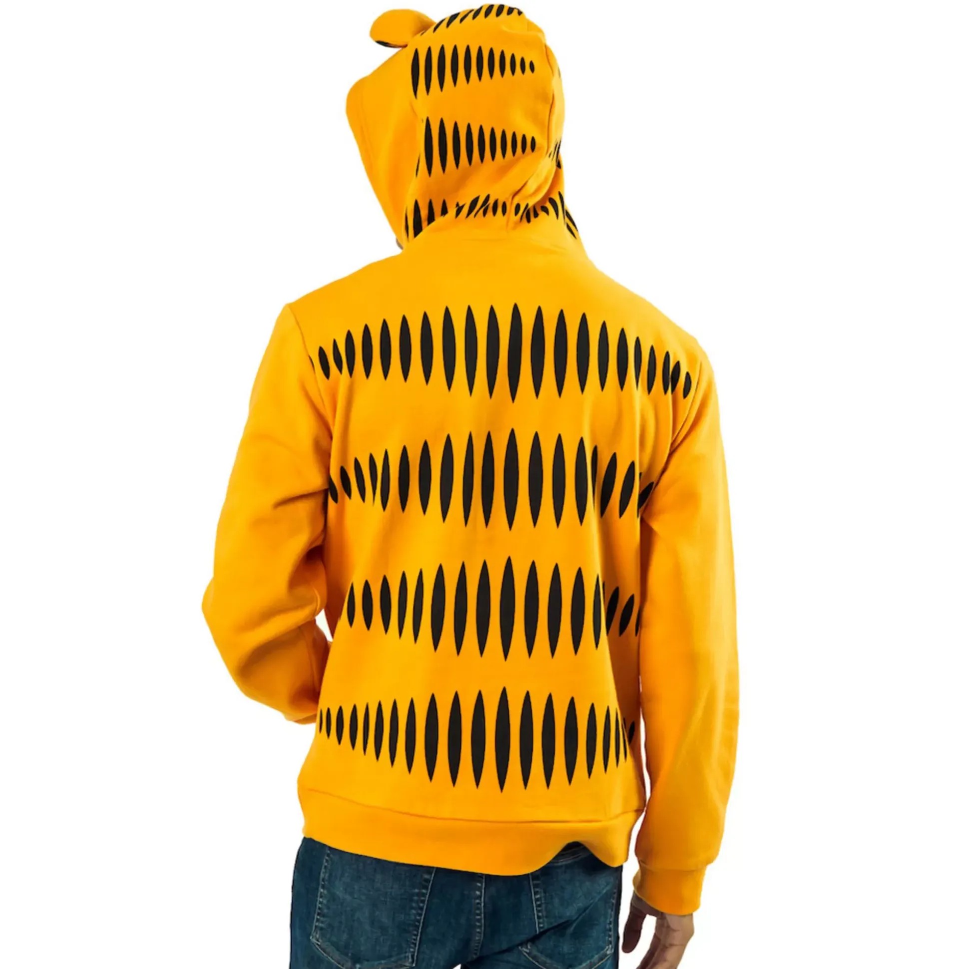 Heat up some lasagna and get ready to relax in this official Garfield hoodie! This cozy hoodie features long sleeves, a hood with attached ears and a drawstring, and black stripe graphics that make you look just like everyone’s favorite cat.