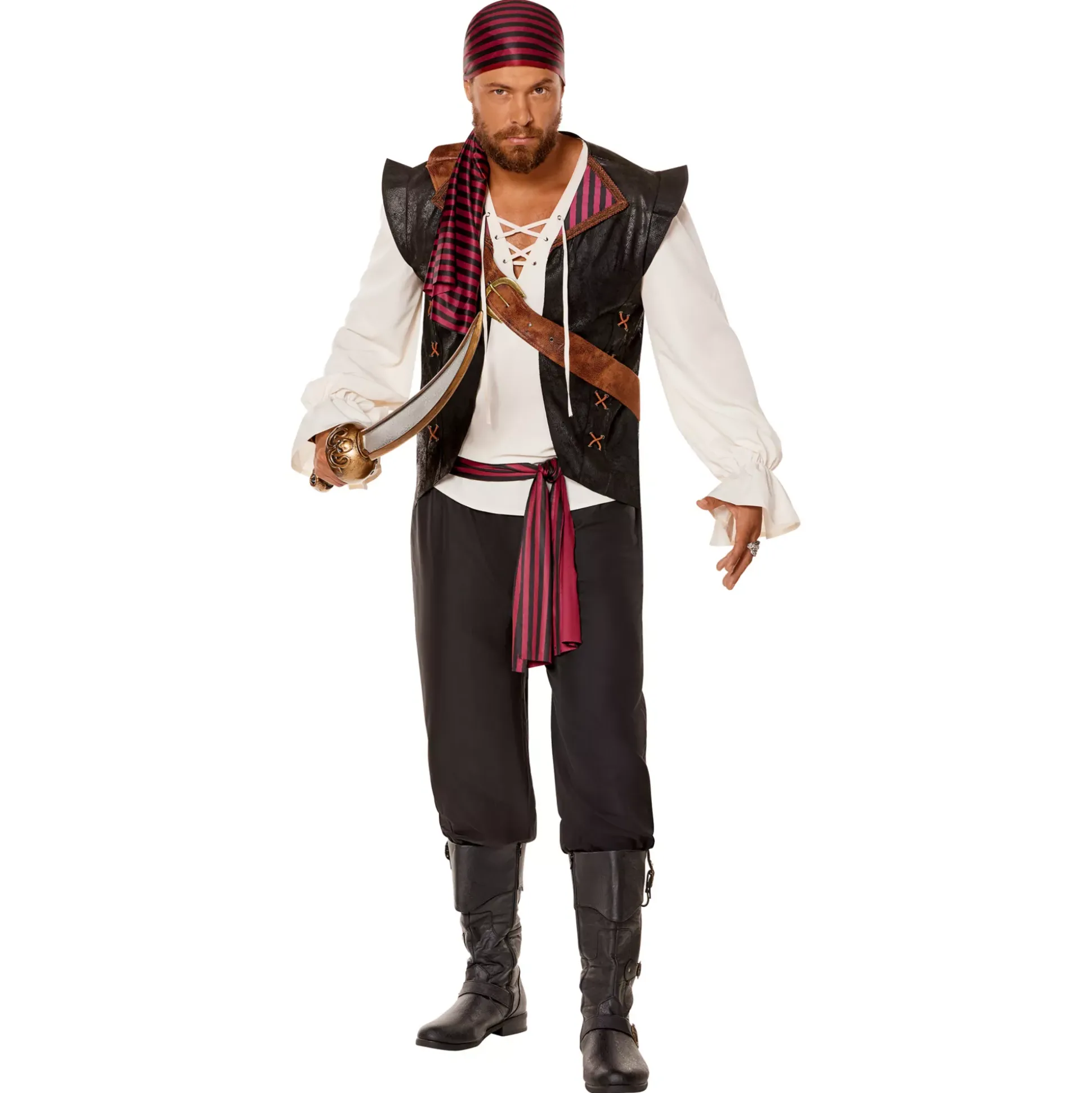 Avast ye! Ready to sail the seven seas in style? This Adult Marauder Pirate Costume is the perfect way to be captain of every costume party this Halloween. This costume includes a lace-up v-neck shirt, pants, a belt, a vest, a sash, and a head scarf.