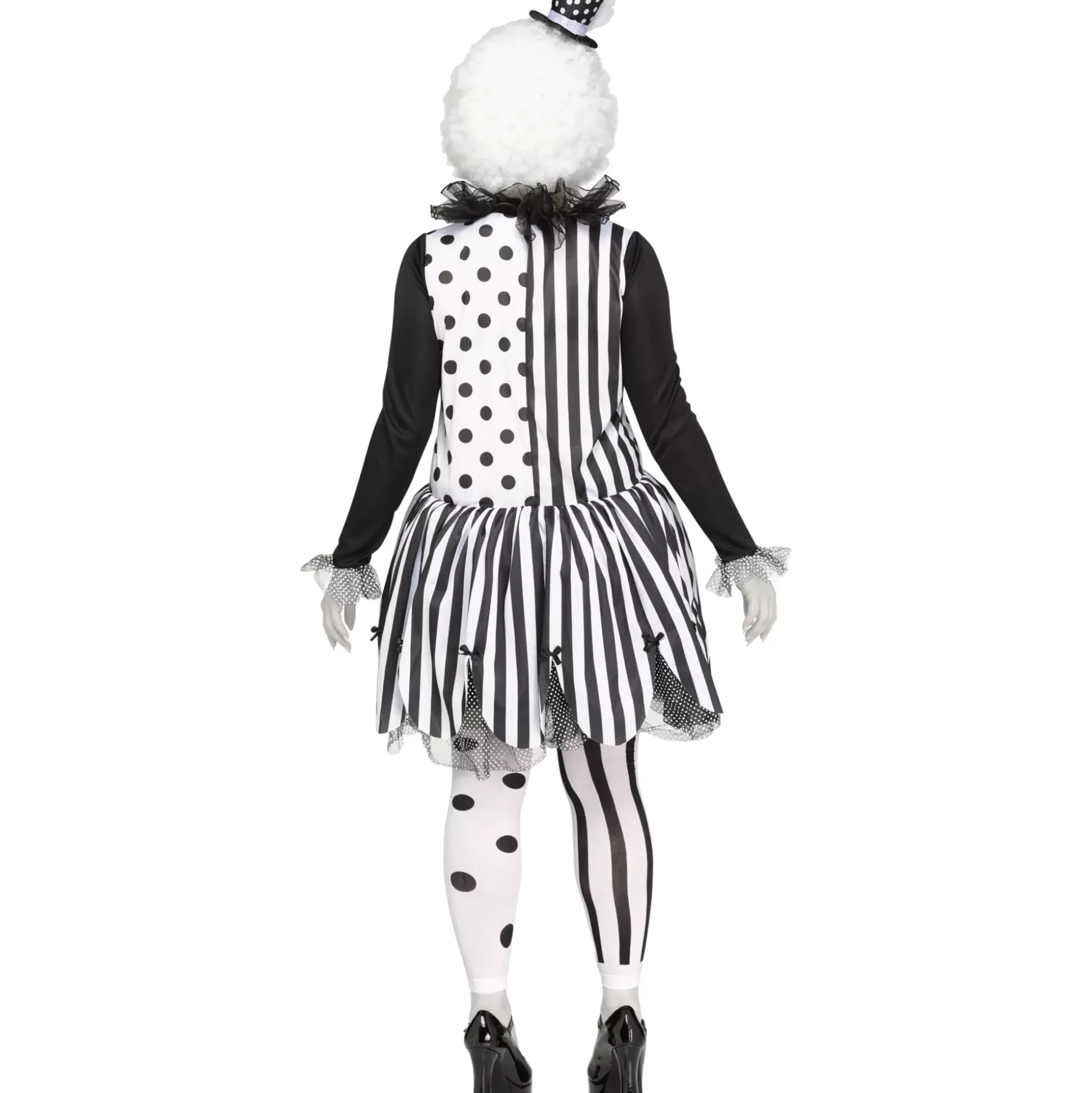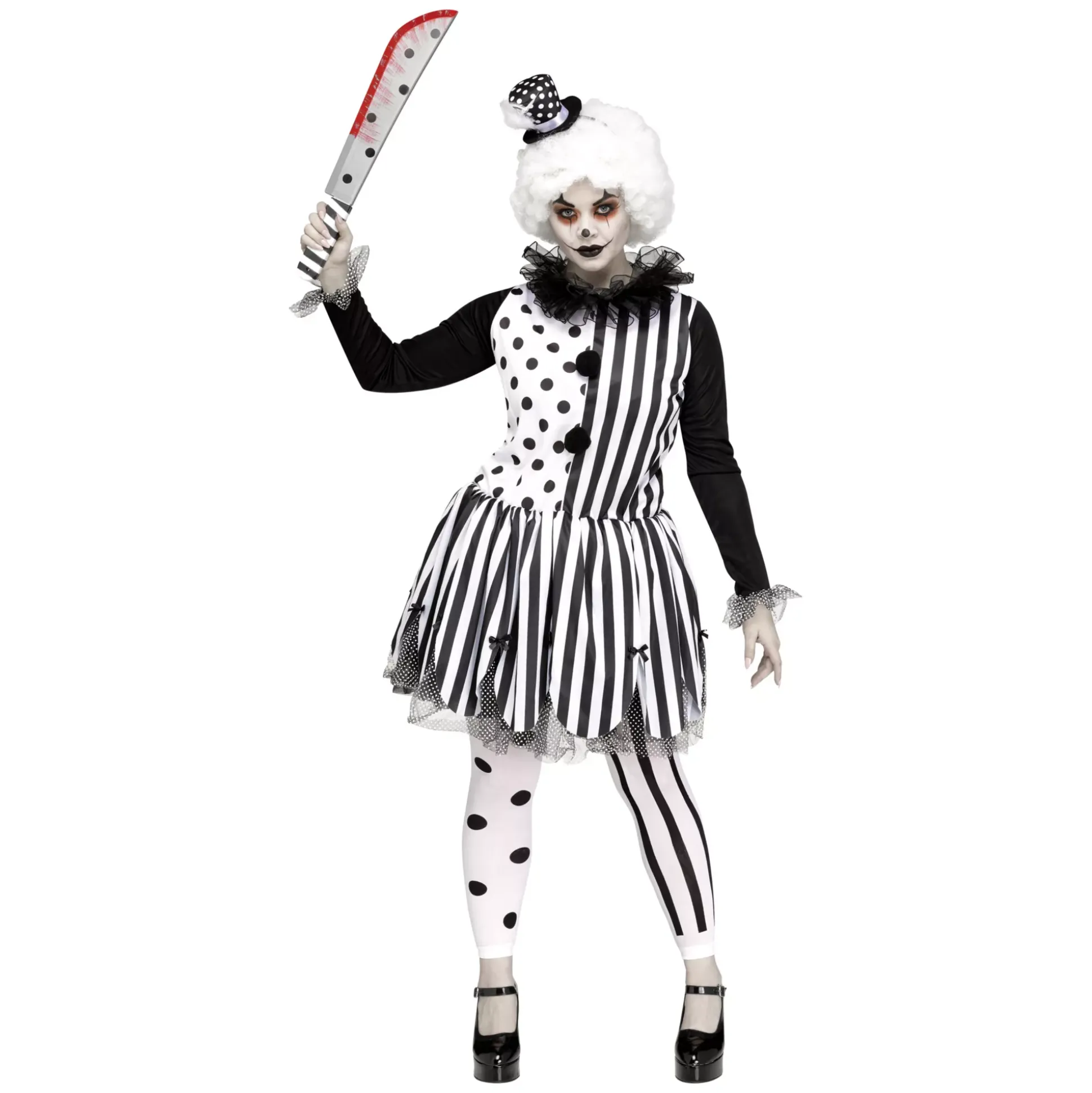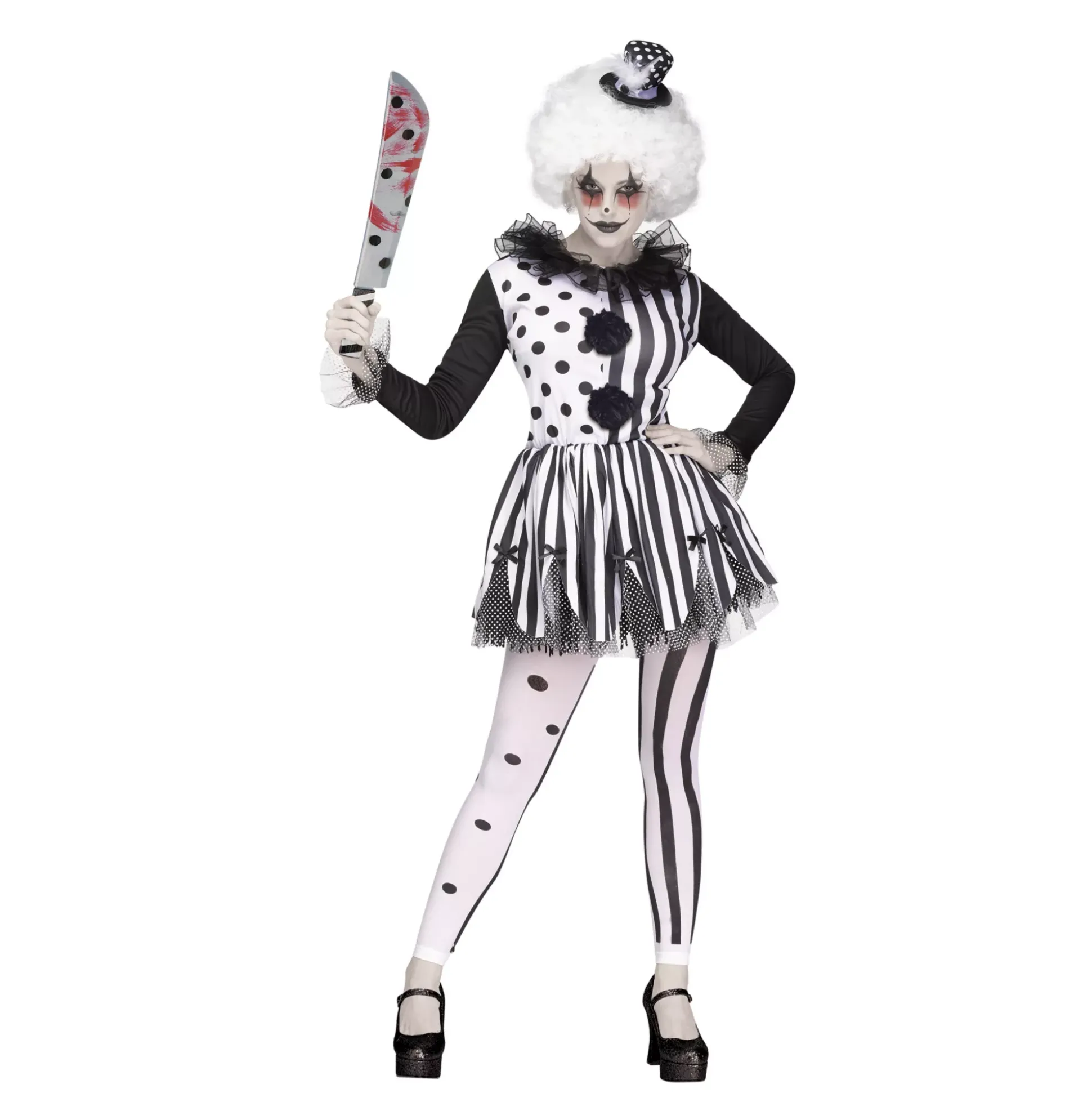 There’s nothing funny about what you’re dressing up as this Halloween. The killer clown costume is the perfect way to show people what you’re really about. The black and white stripped dress with polka dots, hat and footless tights will you the perfect clown look!