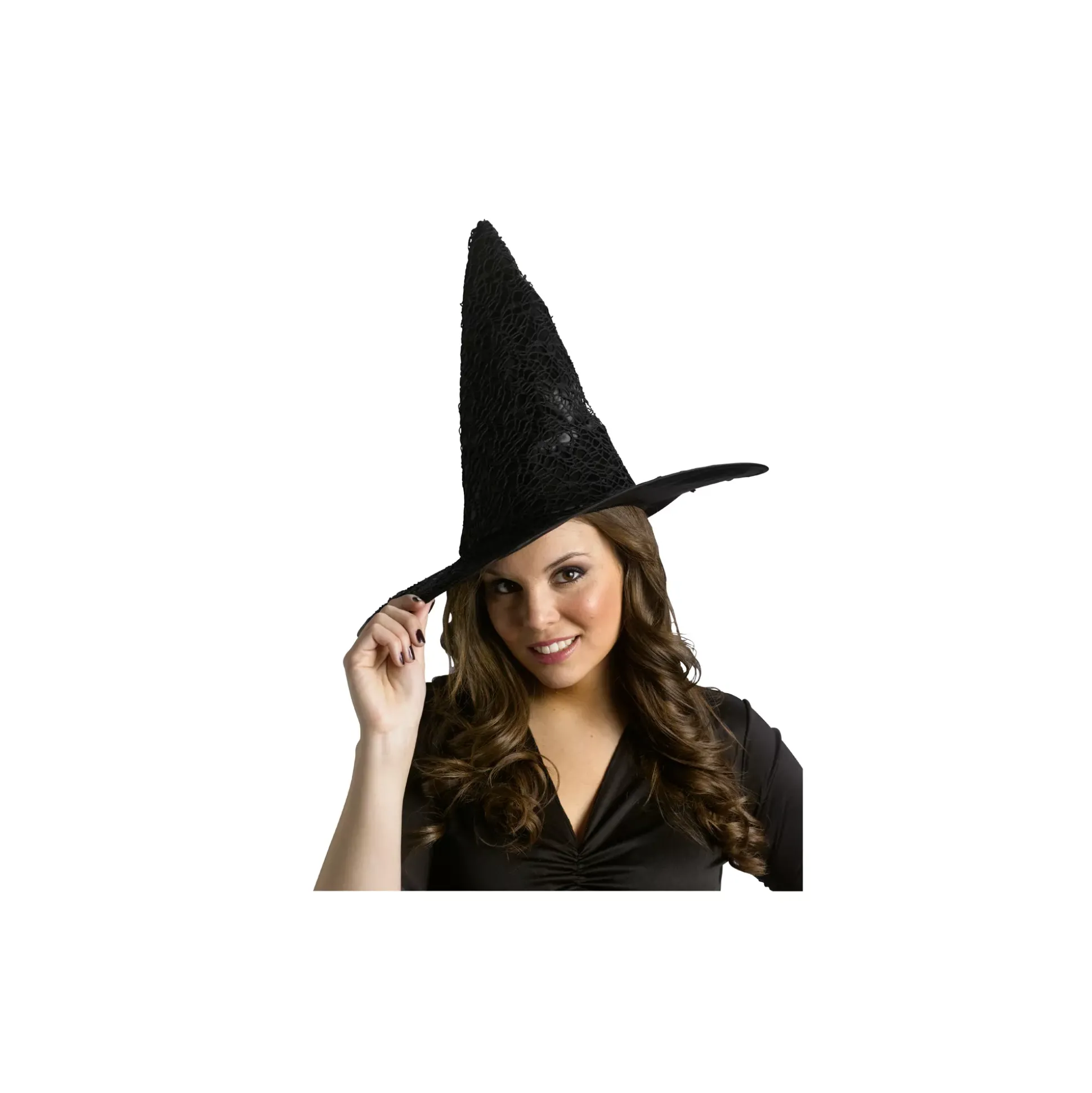 - The black Gothic Witch hat is covered with a black spidery net and has a lace cone and satin brim with contrast piping