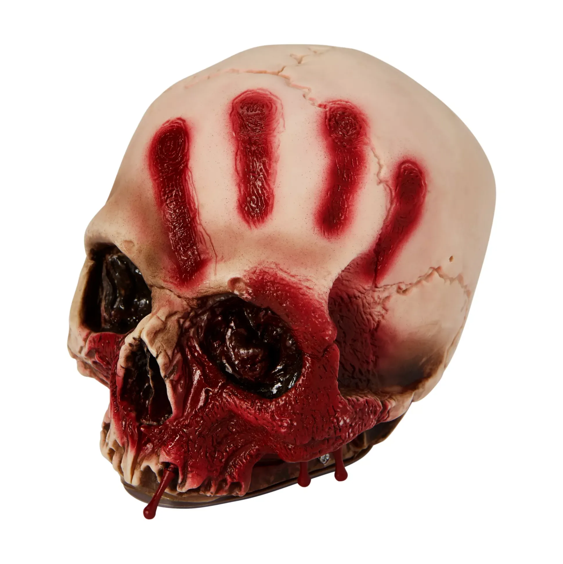 This skull features a bloody handprint on it and is the perfect decoration for any graveyard or skeleton display.