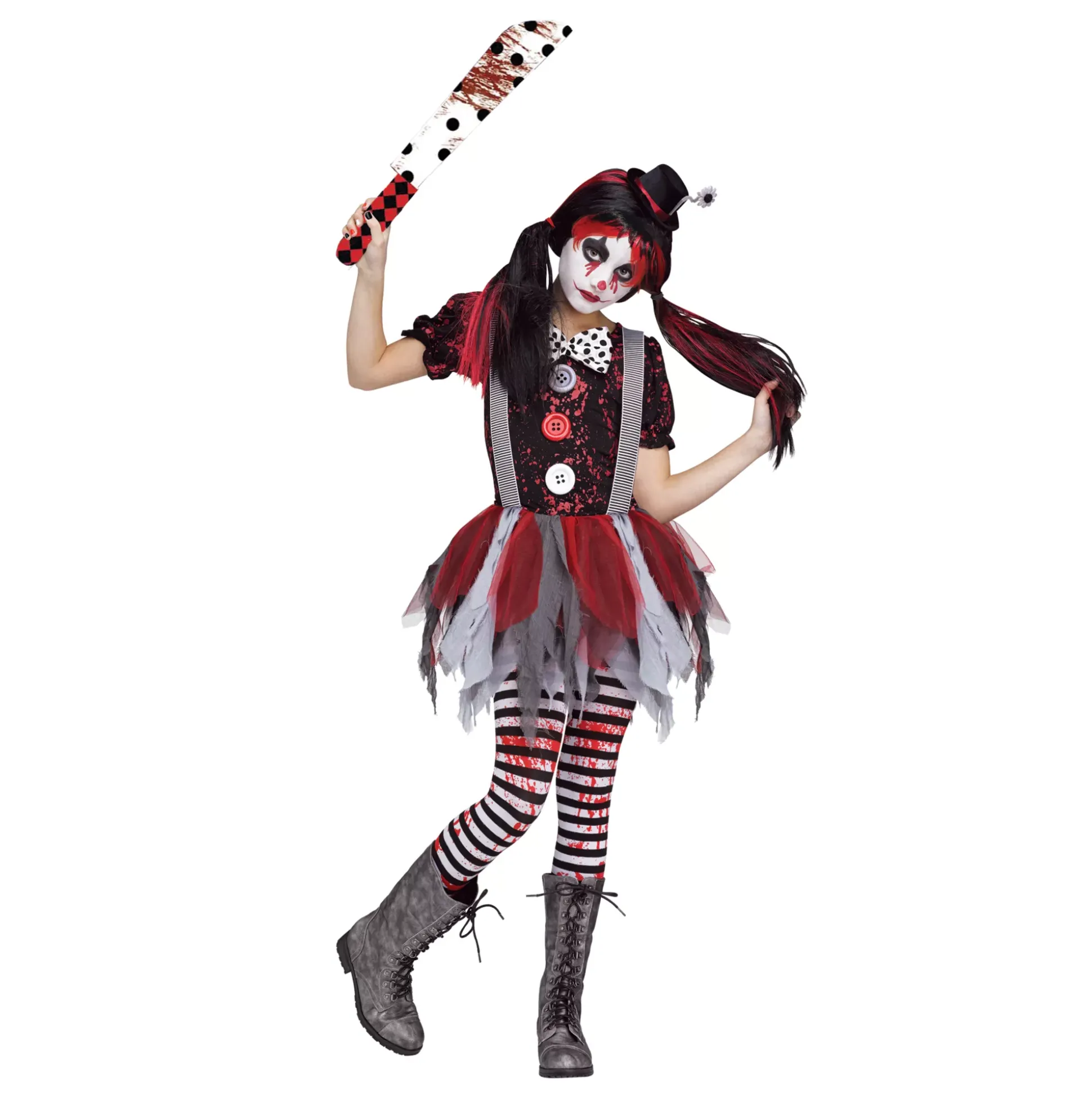 They’ll be lucky to leave the carnival alive when you’re in this Killer Clown Girl’s Costume! Look killer and cute in this dress with a unique red and black pattern top featuring big center buttons and a bow tie. The dress also has suspenders attached to a shredded red and gray tutu skirt, as well as striped tights with your latest victim’s blood. Top the look off with the included hat with flower and your weapon of choice (sold separately) for a perfect mischievous night!