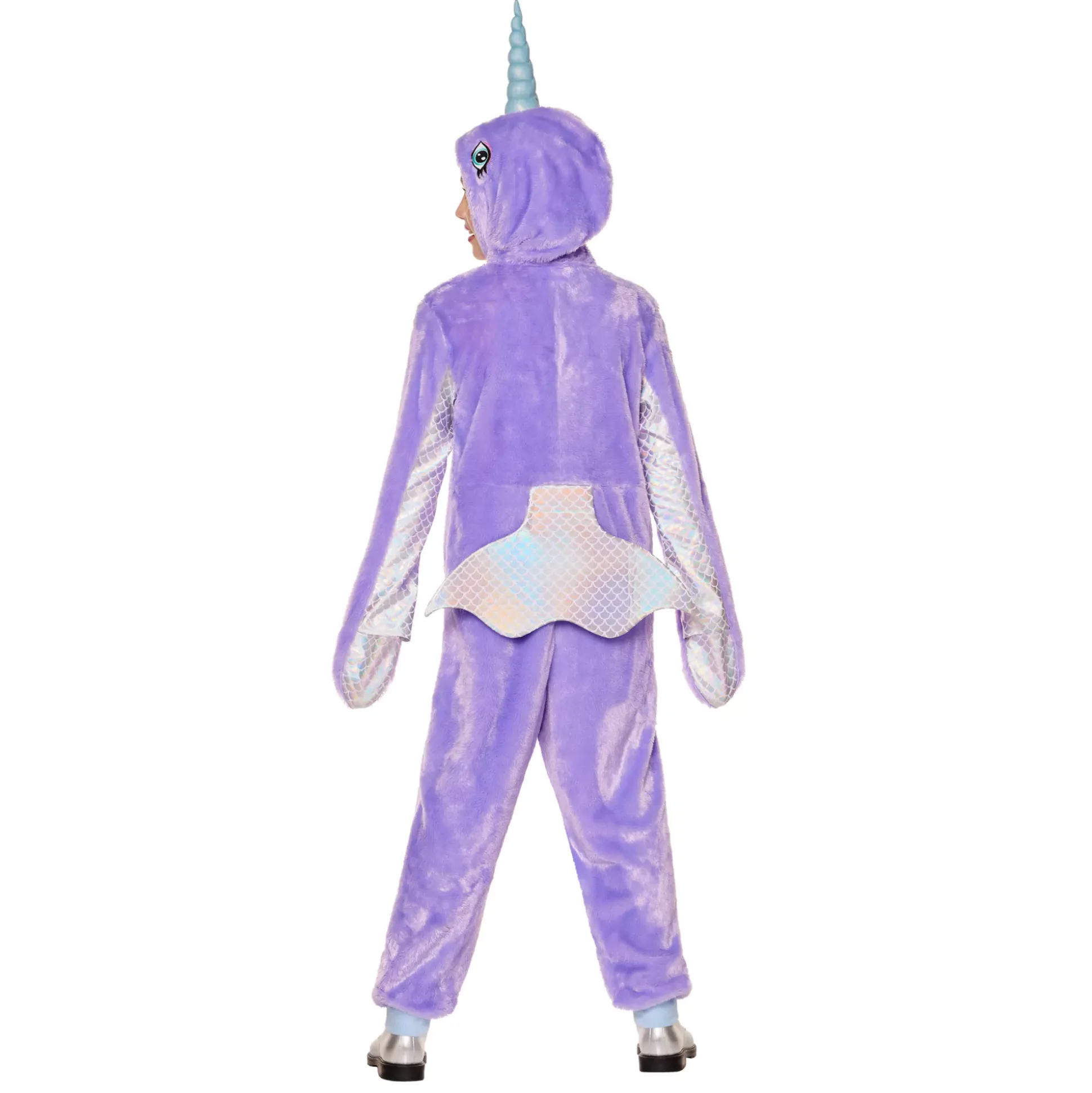 Head out to sea in style when you dress in this kids’ narwhal jumpsuit costume! This costume features plush fabric in a stunning shade of pale purple, and a belly and tail featuring an iridescent scale print. An attached hood features narwhal eyes and a twisted horn. A seashell zipper pull adds a playful touch to this narwhal costume.