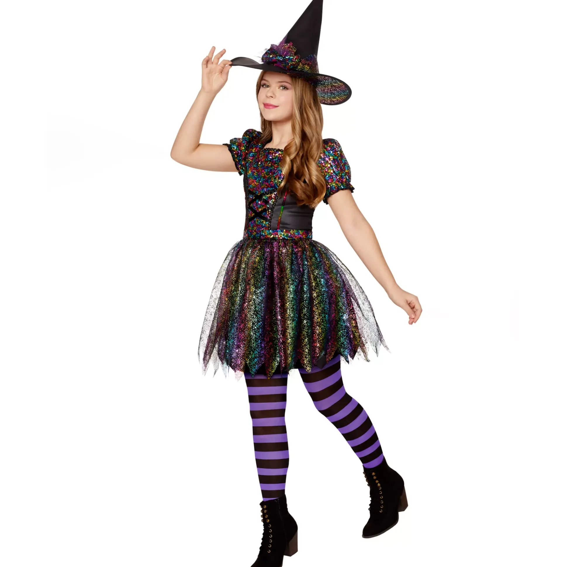 Feel the magic in the air this Halloween when you dress up in this colorful Kids Sequin Witch Costume. This witch costume will have you casting all types of spells this Halloween and includes everything you need to cause some mischief. Featuring a witch hat, dress, and striped tights, you’ll be ready for a wicked time while wearing this costume for Halloween.