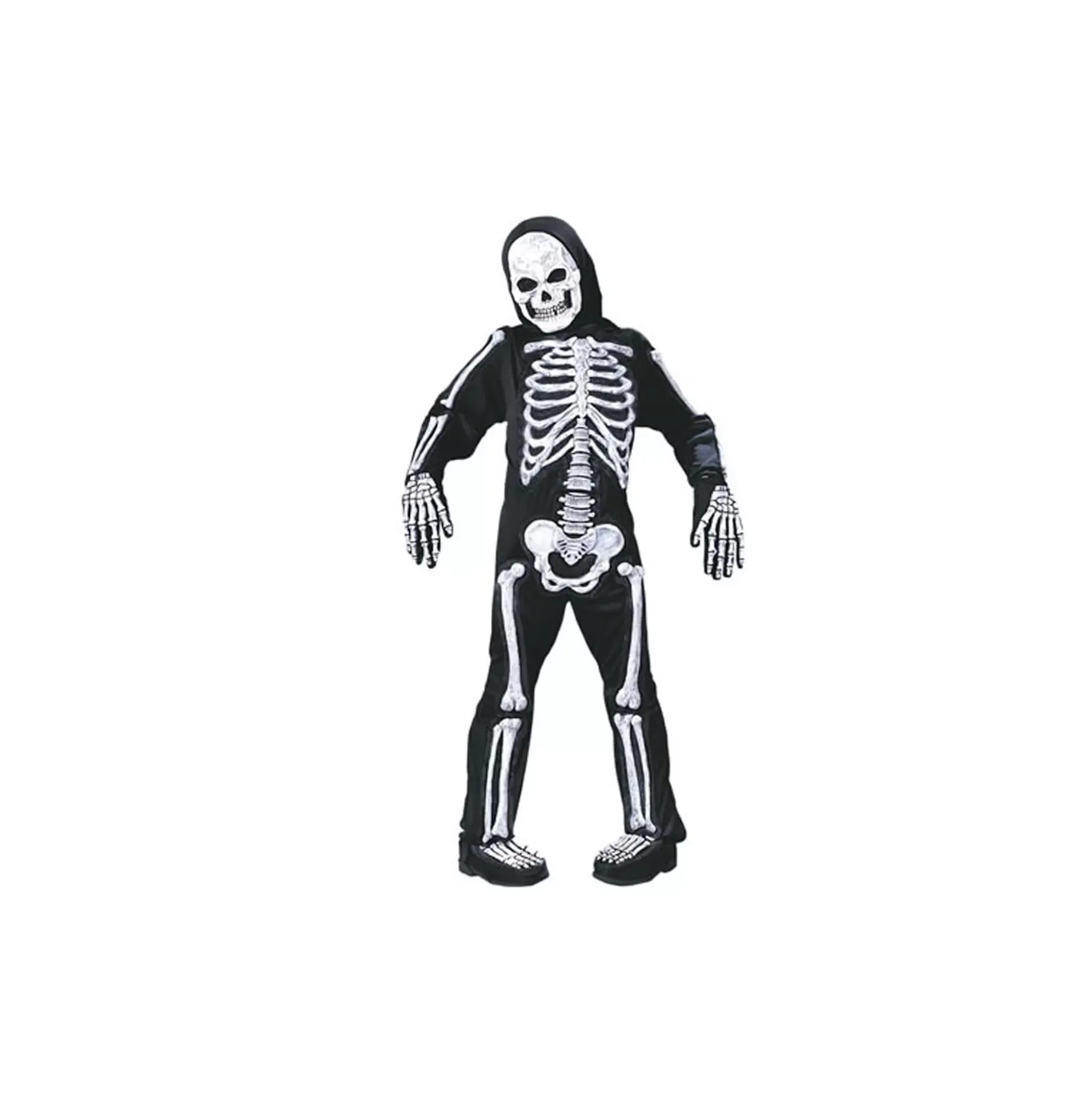 He’s just skull and bones! Creep them out in this creepy cool Totally Skelebones child costume that makes it look like you really are a skeleton. The black jumpsuit is accented with skeletal graphics and comes complete with a mask with a hood, shoe covers and gloves.