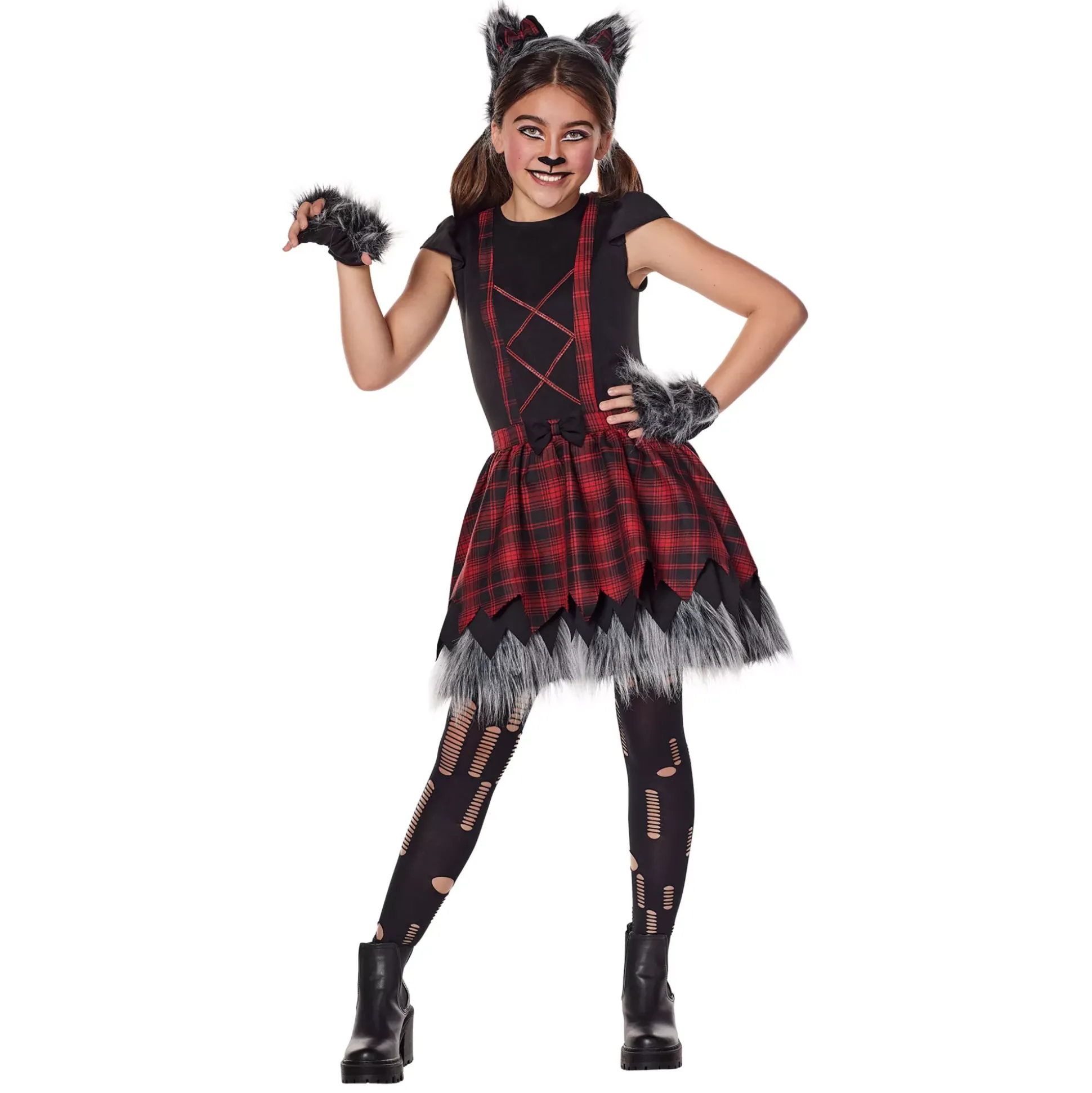 Feeling fierce? Show off your ferocious side when you wear this Wolf Cutie Costume! Featuring a plaid dress with faux-fur detailing, a pair of fingerless gloves, a headband, and a pair of leggings, this costume has everything you need to become a wild werewolf.