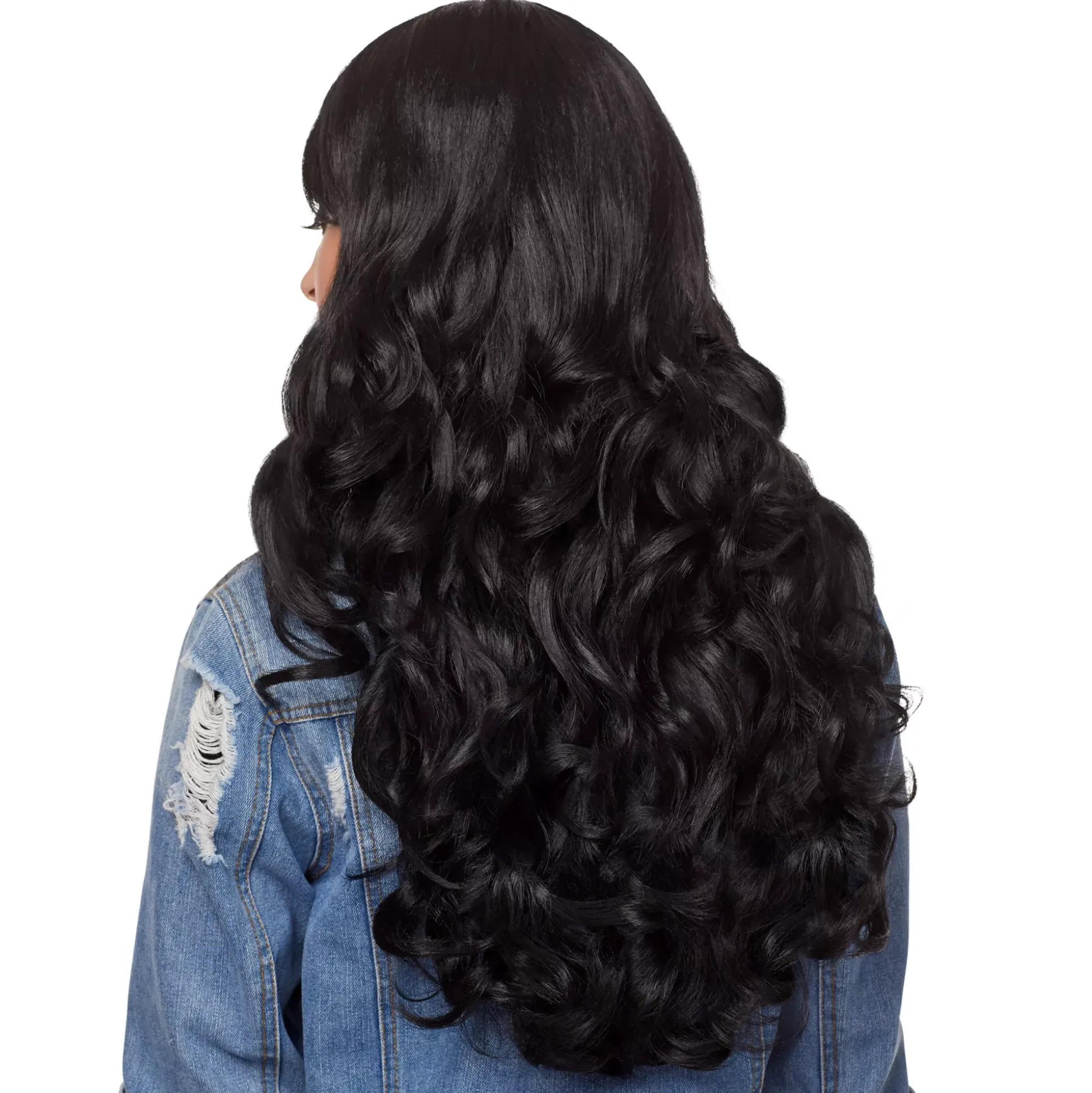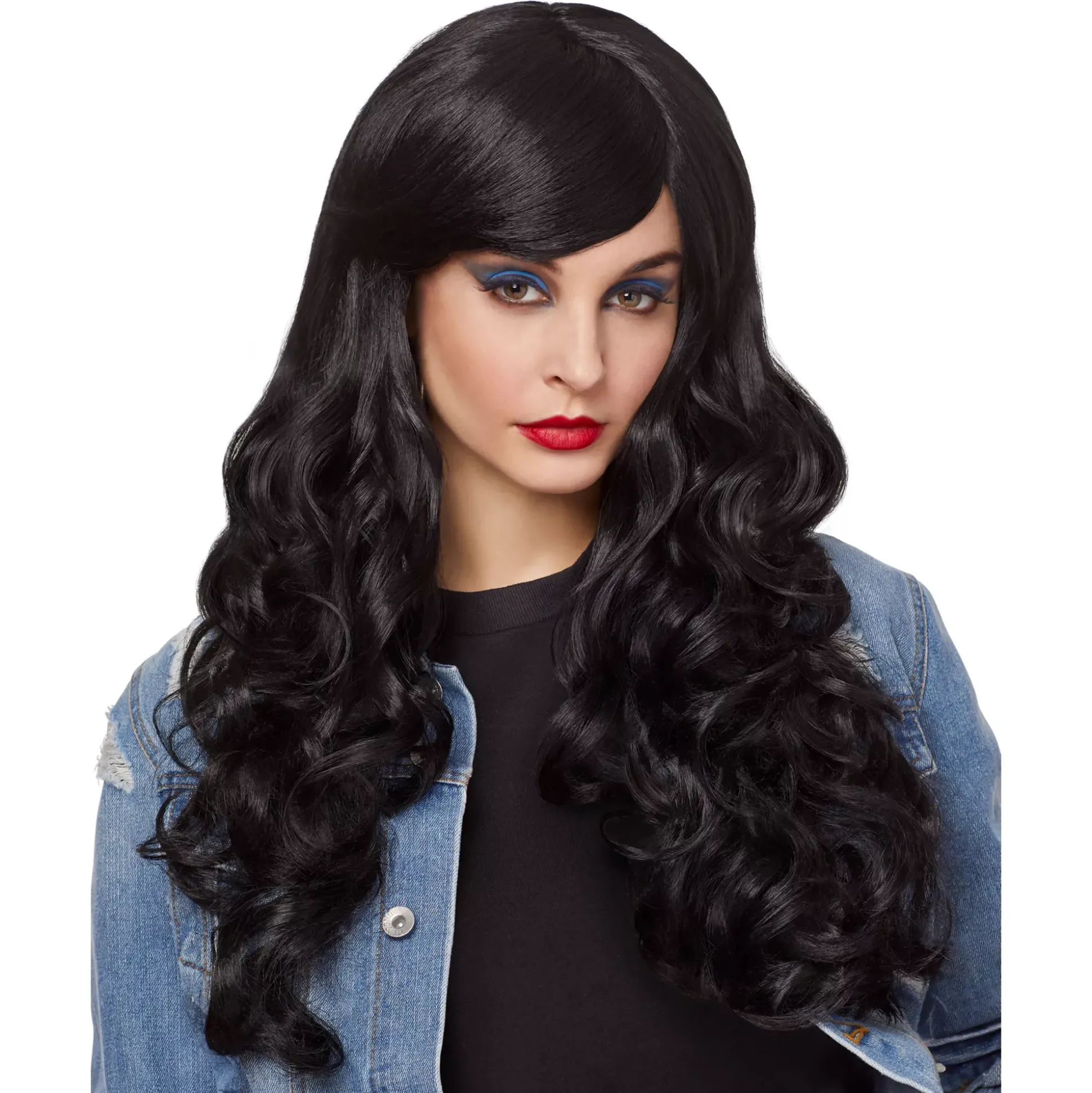 Perfect for nearly any costume, whether spooky or sexy, this Long Black Curly Wig will certainly suit your needs. Long strands of wavy black synthetic fibers comprise this spectacularly natural-looking wig. The possibilities are endless when you add this wig to your collection.