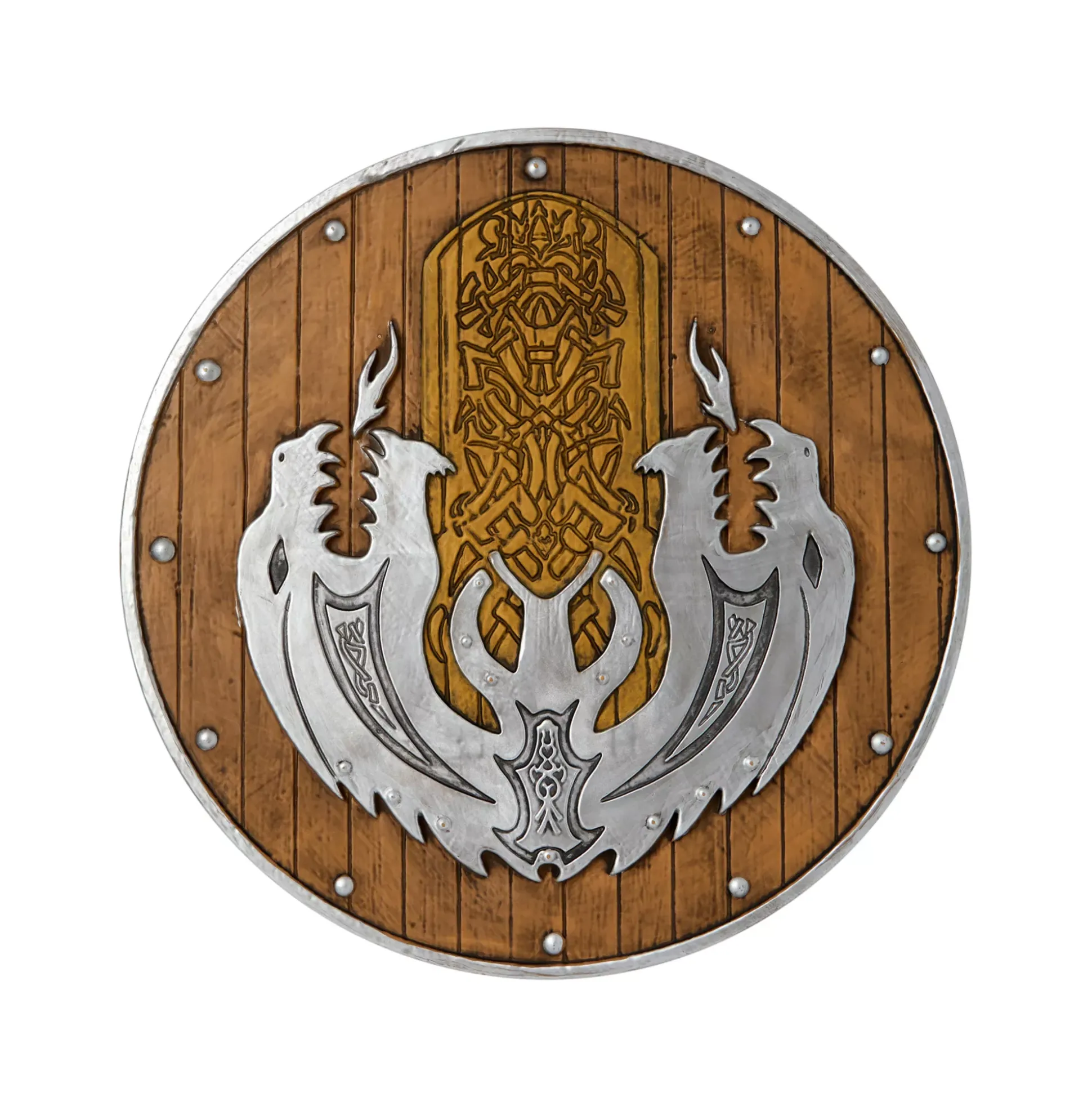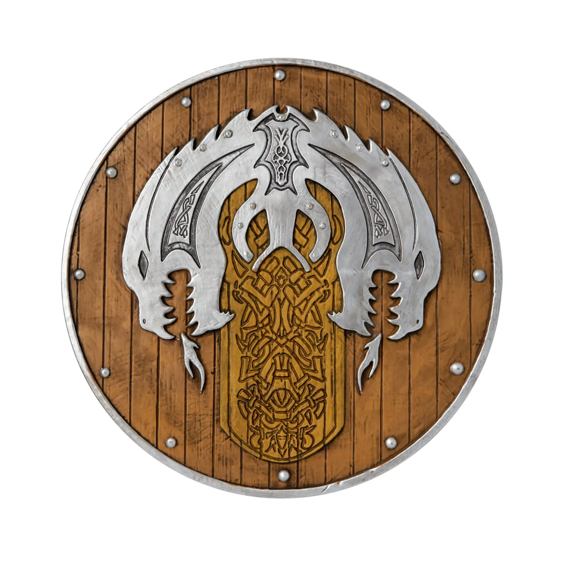 Start your Viking adventure with this battle-ready Viking Shield! This epic shield features brown and silvertone detailing and is adorned with a double-headed dragon. Add this awesome accessory to your Viking costume and complete the look!