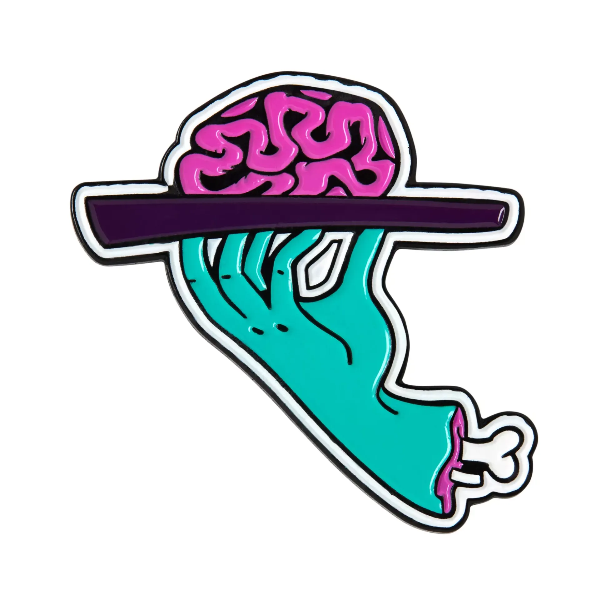 Add some zombie style to your outfit with this set of four pins featuring brains, an eyeball and other zombie-esque images. Use these pins on your jacket, shirt, bag or anywhere else.